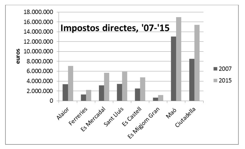 Ell 2015 els menorquins van pagar als ajuntaments 23,3 M€ més que el 2007. Mentre que ha augmentat molt la recaptació per impostos directes, ha disminuït la despesa dels ajuntaments en la seva ciutadania. Una pèrdua de l’efecte benefactor dels doblers municipals. Els impostos per habitant han augmentat i les despeses per habitant, és a dir allò que gasten els ajuntaments repartit entre els habitants, ha disminuït. La diferència de recursos s’ha extret de les economies municipals per anar als bancs principalment per la via de forçar l’amortització dels préstecs preferentment arran de la Llei Montoro. No oblidem el protagonisme dels bancs en la crisi global. Un cop més, què ens treu de la crisi? els doblers dels ciutadans i quan manco els podien aportar. Açò ha succeït al llarg de la crisi, quan molts ciutadans han estat més en atur, quan cobren salaris per davall del que els correspon i quan els serveis públics s’han retallat.