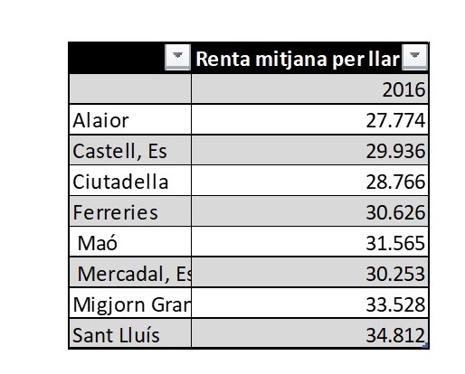 L’Institut Nacional d’Estadística (INE) ha publicat el mes de setembre dades d’ingressos per llar i per unitat de consum familiar que situen Alaior en la darrera posició en renda familiar. Permeten tenir una visió objectiva de com l’economia afecta les famílies i les persones del nostre municipi. Anteriorment ja s’havien conegut les dades de renda mitjana per persona de 2016, que van situar els alaiorencs en la 7a posició de Menorca, (21.964 €) a pocs euros de la darrera (21.774 €). L’INE ha conjuntat dades d’Hisenda amb dades del padró i amb altres de l’Administració per elaborar aquesta nova estadística que ha de funcionar a nivell europeu per detectar desigualtats socials. La mitjana per família d’Alaior és de 27.774 €, després la segueix Ciutadella a 1.000 €. La més alta, com també passa a nivell de renda individual, és la de Sant Lluís, amb 34.812 €. Són molt interessants els casos de Ferreries i es Migjorn Gran que a nivell individual ocupen posicions pitjors però en renda familiar milloren molt la seva posició, compensen el nivell baix individual, sumant ingressos a la mateixa llar. Alaior acumula males posicions en renda individual i familiar. L’INE ha publicat altres dades al mateix temps. Una d’elles és el percentatge de la població que té ingressos inferiors a 10.000 € per unitat de consum. Les unitats de consum són una mitjana de les persones que conviuen en una casa. Serveix per calcular el llindar de la pobresa, es calcula que no hi ha risc de pobresa per damunt dels 10.000 € per unitat de consum. En aquest indicador veiem que es Mercadal, Ciutadella i Alaior tenen un 24% de la població per davall d’aquest nivell, un de cada 4 és vulnerable, no pobre.