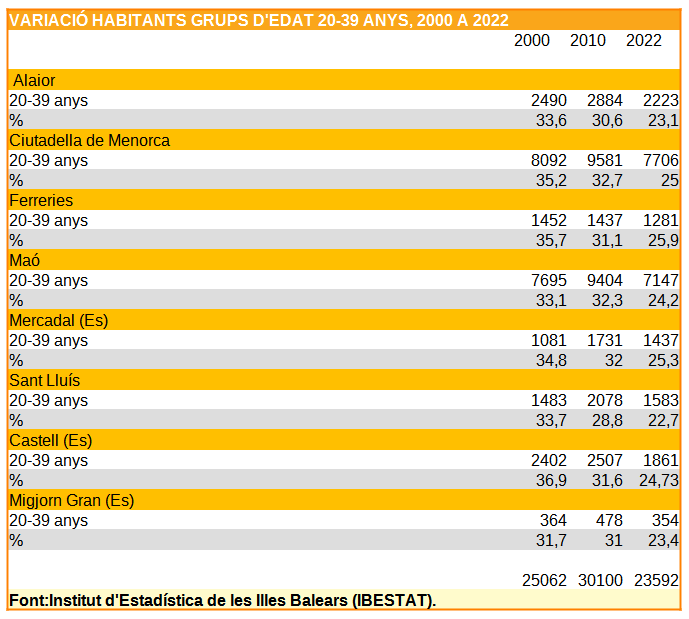 Els joves de les franges d’edat entre 20 i 39 anys han disminuït en nombres absoluts i en percentatge en el conjunt dels habitants de Menorca. Van arribar a ser 30.100 habitants l’any 2010, mentre que el 2022 només són 23.592 hab. En termes generals, des de l’any 2000 el seu pes específic ha disminuït dins la població dels diferents municipis de Menorca. De representar un percentatge del 35 % llavors, actualment són poc menys del 25 % del conjunt de la població.