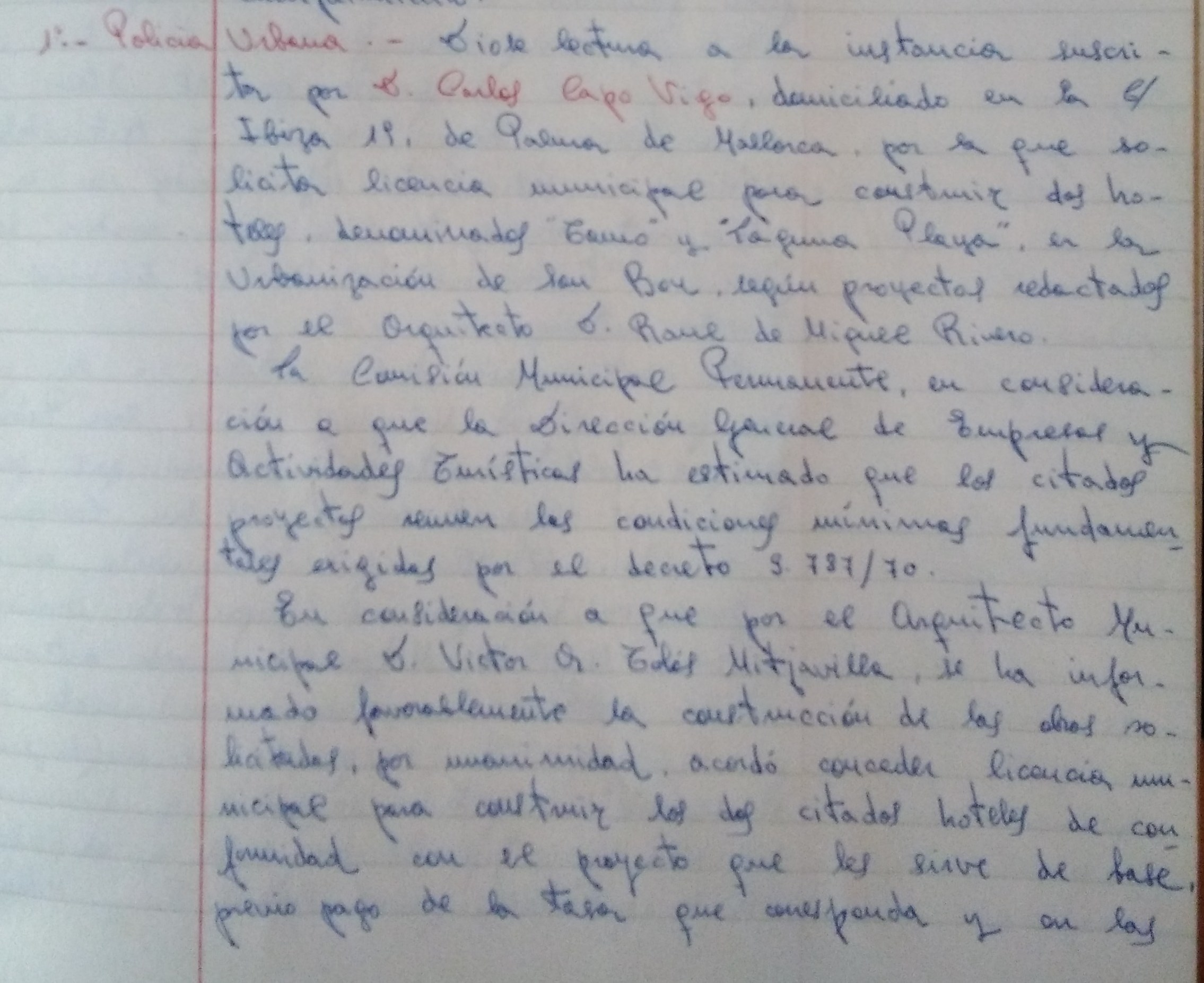 “POLICIA URBANA. Diose lectura a la instancia subscrita por D. Carlos Capo Vigo, domiciliado en la calle Ibiza 19, de Palma de Mallorca, por la que solicita licencia municipal para construir dos hoteles denominados “Tamo” y “Laguna Playa” en la urbanización de Son Bou, según los proyectos redactados por el arquitecto Sr. Raúl de Miguel Rimero.