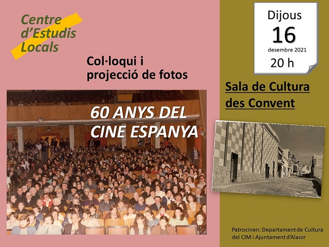 Farem un col·loqui del perquè del Cine Espanya, del que va suposar per a la societat local d’aquell temps. Projectarem una seixantena d’imatges des de 1961 fins al seu enderrocament. Gran part de les fotos són de la col·lecció de Pere Alzina cedides a l’Arxiu d’Imatge i So de Menorca.