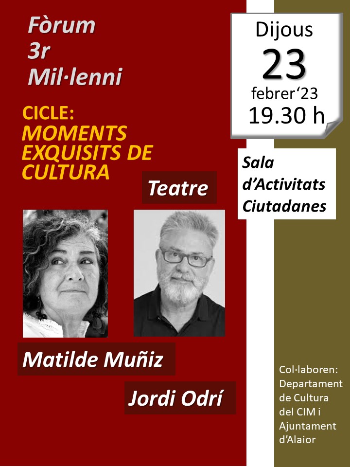 Dijous 23 de febrer a les 19.30, el Fòrum 3r Mil·lenni organitza una altra sessió dintre del cicle Moments exquisits de cultura, serà a la Sala d’Activitats Ciutadanes de l’Ajuntament d’Alaior a les 19.30h.