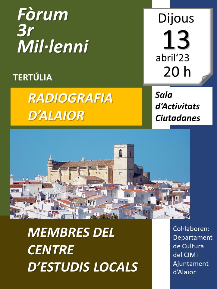 Radiografia d’Alaior. Membres del CEL. Tertúlia. Dijous 13 d’abril. 20 h. Sala d’Activitats Ciutadanes.