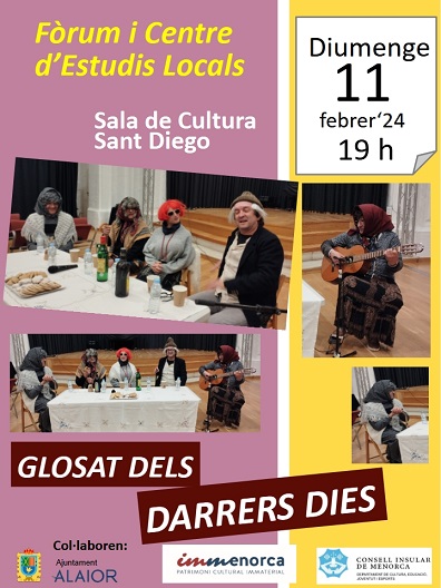 Diumenge dia 11 de febrer. A les 19 h. A la Sala de Cultura de Sant Diego. Organitzat pels Glosadors d’Alaior i el CEL.