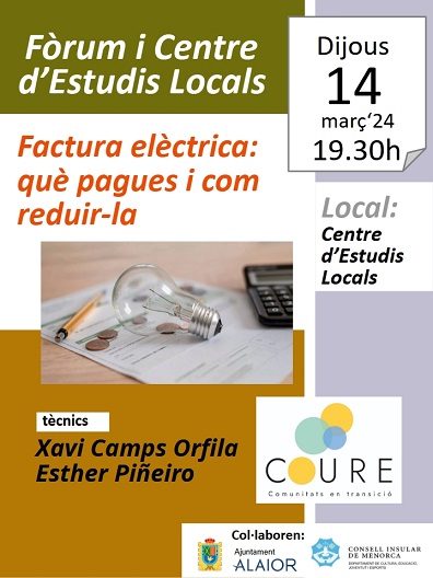 Aquesta setmana, dijous 14, xerrada al nostre local, a les 19.30h. Si portau la factura elèctrica encara que sigui en el mòbil podreu resoldre més dubtes.