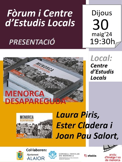 PRESENTACIÓ DEL LLIBRE MENORCA DESAPAREGUDA. DIJOUS 30 DE MAIG’24. 19.30 h. LOCAL DEL CENTRE D’ESTUDIS LOCALS.