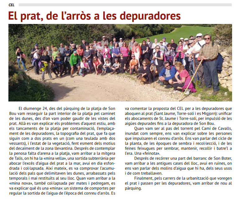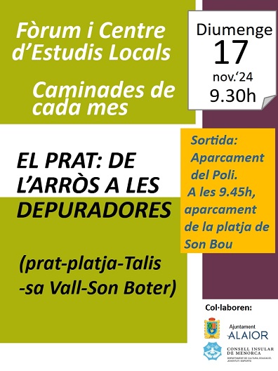 Diumenge 17, caminada. Sortida de l’aparcament del Poli a les 9.30h. De l’aparcament de la platja de Son Bou a les 9.45h. Recorregut per la geografia, la història, l’actualitat i el futur del prat. Entorn d’uns 6,5 km en total. Acabament sobre les 13.30 h. Dificultat baixa.