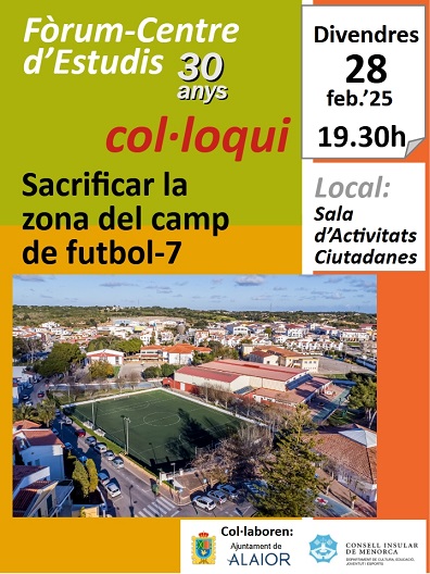 Divendres 28 de febrer’25, a les 19.30h a la Sala d’Activitats Ciutadanes, farem un col·loqui amb tots els ciutadans i col·lectius interessats en intentar salvar el camp de futbol-7, pel que representa de bona activitat física per a tothom, com a zona verda i com a una de les zones del poble més moderna i ben aconseguida al llarg de les darreres dècades de la història d’Alaior. Ànims, que no es digui que a Alaior no hi ha gent ben viva que estima i es mou per allò que hem fet entre tots!