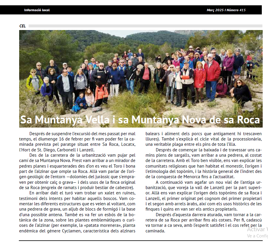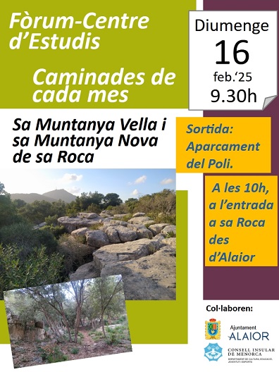 Diumenge  16 de febrer’25 anirem d’excursió a sa Muntanya Vella i sa Muntanya Nova de sa Roca. Uns 4,8 Km aproximadament. Dificultat baixa. Només té una costa al principi, però d’uns pocs minuts. Després el camí ascendent es va combinant amb camí més planer i finalment una baixada llarga i una volta també plana per damunt la vall de Lanzell. És una passejada entre pinar i alzinar amb un paisatge interessant. Millor si portau bastons, sempre ajuda. Partida del Poli d’Alaior a les 9.30h i de la urbanització de sa Roca a les 10h (ens trobarem després de la portellada d’entrada a la urbanització arribant des d’Alaior).