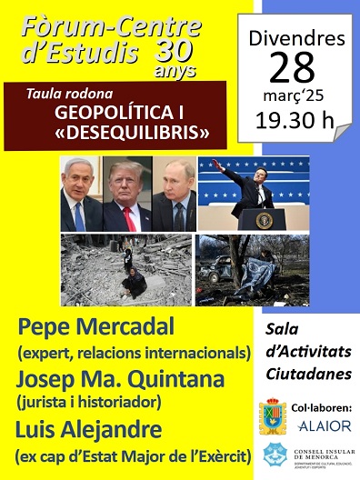 TAULA RODONA: GEOPOLÍTICA I “DESEQUILIBRIS”. DIVENDRES 28. MARÇ’25. A LA SALA D’ACTIVITATS CIUTADANES. 19.30 H.