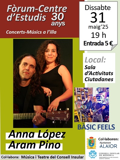 Dissabte 31, Anna López i Aram Pino (Basic Feels), a la Sala d’Activitats Ciutadanes. És un duo de guitarra acústica i veu format el 2020. Fan versions en acústic de pop rock nacional i internacional així com cançons tradicionals menorquines.