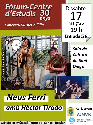 Dissabte 17, Neus Ferri i Hèctor Tirado a la Sala de Cultura Sant Diego. Cantautora alcoiana establerta a Menorca. Premi Ovidi Montllor al millor disc rock 2022 i premi Carles Santos de la Música Valenciana al millor disc pop 2022. L’acompanya Hèctor Tirado, autor de molts arranjaments de diferents bons músics valencians i un gran mestre de la guitarra.