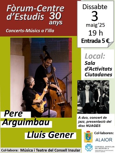 Dissabte 3, Pere Arguimbau i Lluís Gener (A Duo) a la Sala d’Activitats Ciutadanes. Pere Arguimbau és professor de guitarra, harmonia, improvisació i combo. Lluís Gener Bosch és professor de baix elèctric, combo, big band, harmonia i llenguatge. Amb més de dues dècades creant música junts, ambdós han cultivat una connexió musical única, modelada per innumerables hores d’assaig, improvisació i actuacions en viu. El disc NUAGES ha volgut capturar l’essència de la seva música amb una experiència de creació d’un ambient íntim, sofisticat i elegant, que transcendeix el temps i l’espai i que convida a la reflexió i a l’emoció.