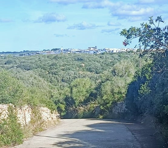 Se retorna por el mismo camino para seguir observando ciertos puntos. Como las tancas que se extienden en la distancia a la derecha. Después de pasar por segunda vez por es Taronger y Binifamís con su cartel artesanal, se baja la cuesta tan empinada que ahora sirve para disfrutar el descenso. Pero antes se puede apreciar claramente la silueta de Alayor arriba y en la distancia, una perspectiva interesante que nos recuerda de donde partimos en esta ruta.