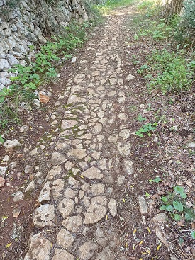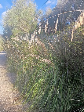 Ahora se sube una cuesta muy larga y empinada, bordeada por hierbas con tallos altos, de nombre carrizos.Tienen largas plumas en el extremo de sus tallos curvos y parece que hacen una reverencia a la gente que pasa, pero cuidado -con hojas que pueden cortarte la piel. Su nombre Ampelodasmus Mauritanicus indica su procedencia del noroeste de África y aquí se ha convertido en una planta muy común.