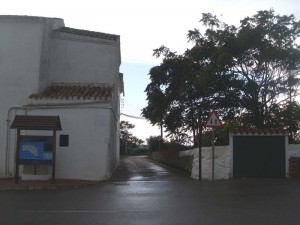 Inici del camí. El camí no té cap rètol de Camí Vell del Toro però sí hi ha altres indicacions de rutes cicloturístiques. L’edifici que hi ha a l’esquerra és una part de l’església de sant Pere Nou.