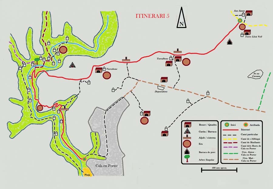Punt de partida i d’arribada: Comença en el Camí de s’Alblagai entrant des de la carretera d’Alaior a Cala en Porter. A 500 metres del punt d’arribada del itinerari 3. Arriba fins a la platja de Cala en Porter.