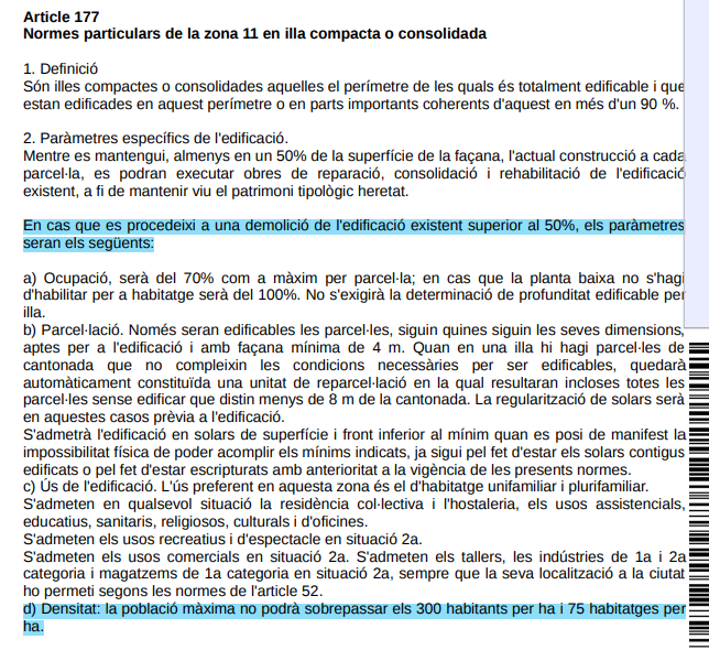 Quan s’enderroqui el 50 % de l’edificació existent, llavors sí que en l’apartat “d” d’aquest apartat i, només en aquets cas, li és d’aplicació la limitació de la densitat.