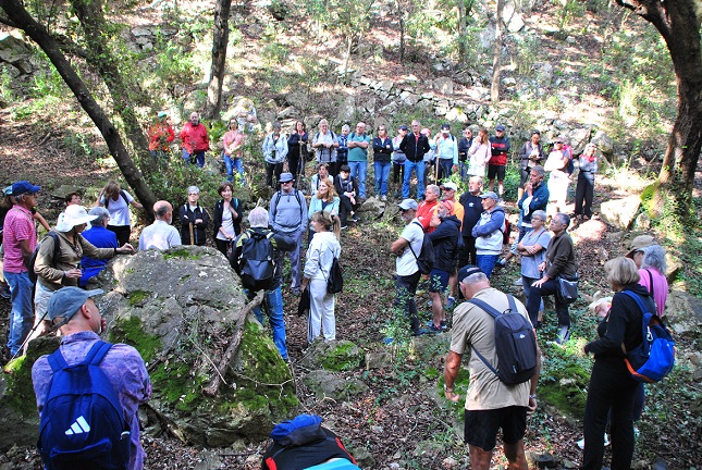 Vam penetrar dins els alzinars. Va ser quan vam tractar dels banys de bosc. Una pràctica reconeguda des de fa dècades al Japó. També anomenats banys forestals. Un passeig per dins el bosc augmenta l’hormona adiponectina. Els nivells baixos d’aquesta hormona es relacionen amb la obesitat, la diabetis mellitus tipus 2, les malalties cardiovasculars i la síndrome metabòlica, entre altres trastorns. Al Japó hi ha 44 boscos acreditats per fer-hi banys de bosc. Es respiren fitoncides (olis essencials de la fusta), són compostos volàtils amb activitat antimicrobiana derivats dels arbres. Al Japó estan reconeguts com a relaxants i per al tractament de l’estrès. Els fitoncides activen unes proteïnes que ens defensen de les infeccions i els tumors, disminueixen la pressió arterial i la freqüència cardíaca. També el contacte amb els bacteris de la terra de bosc és antidepressiu, eleva el nivell d’energia i el funcionament cognitiu. Els banys de bosc són recomanables dues vegades a la setmana. Vam debatre sobre les possibilitats de fer aquesta pràctica a Menorca davant l’actitud de més propietaris de restringir el trànsit per les propietats privades, quan a Menorca només hi ha Alfurí com a única zona forestal pública.